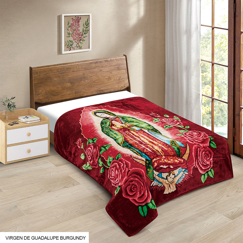 The Supreme Heat 1 Ply Blanket in Dark Brown, Red, Blue, Green, Virgen De Guadalupe Burgundy offers unmatched warmth and timeless elegance. Its vibrant floral centerpiece and ultra-soft Raschel fabric make it the perfect choice for luxurious comfort year-round.